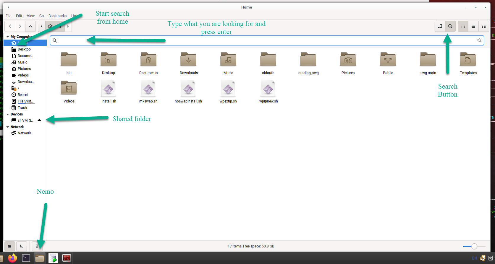 The easiest way to search for files in the VM is to use Nemo, as illustrated in the following screenshot. You set up a shared folder on a hard drive for your VM, copy the files to the share, and then from the share to the client folder.