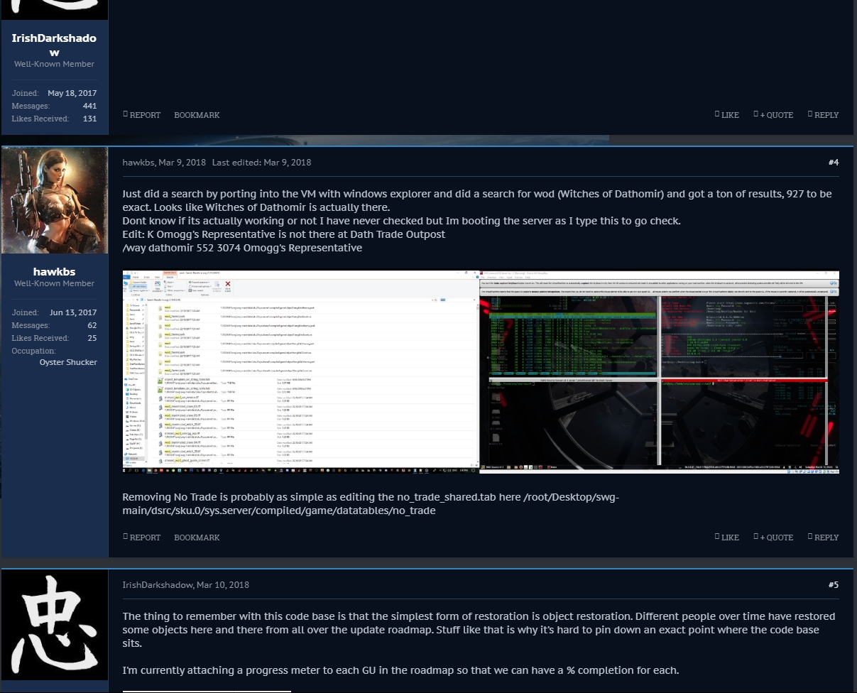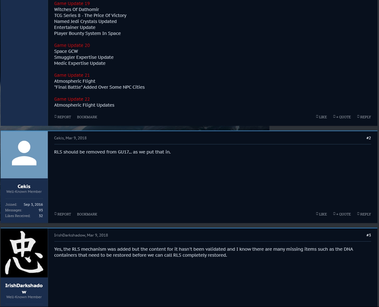 Game Update 22 Atmospheric Flight Updates REPORT BOOKMARKLIKE + QUOTE REPLY Cekis Cekis Well-Known Member Joined:Sep 3, 2016 Messages:93 Likes Received:32 #2Cekis, Mar 9, 2018 RLS should be removed from GU17... as we put that in. REPORT BOOKMARKLIKE + QUOTE REPLY IrishDarkshadow IrishDarkshadow Well-Known Member Joined:May 18, 2017 Messages:441 Likes Received:131 #3IrishDarkshadow, Mar 9, 2018 Yes, the RLS mechanism was added but the content for it hasn't been validated and I know there are many missing items such as the DNA containers that need to be restored before we can call RLS completely restored. REPORT BOOKMARKLIKE + QUOTE REPLY hawkbs hawkbs Well-Known Member Joined:Jun 13, 2017 Messages:62 Likes Received:25 Occupation:Oyster Shucker #4hawkbs, Mar 9, 2018 Last edited: Mar 9, 2018 Just did a search by porting into the VM with windows explorer and did a search for wod (Witches of Dathomir) and got a ton of results, 927 to be exact. Looks like Witches of Dathomir is actually there. Dont know if its actually working or not I have never checked but Im booting the server as I type this to go check. Edit: K Omogg's Representative is not there at Dath Trade Outpost /way dathomir 552 3074 Omogg's Representative