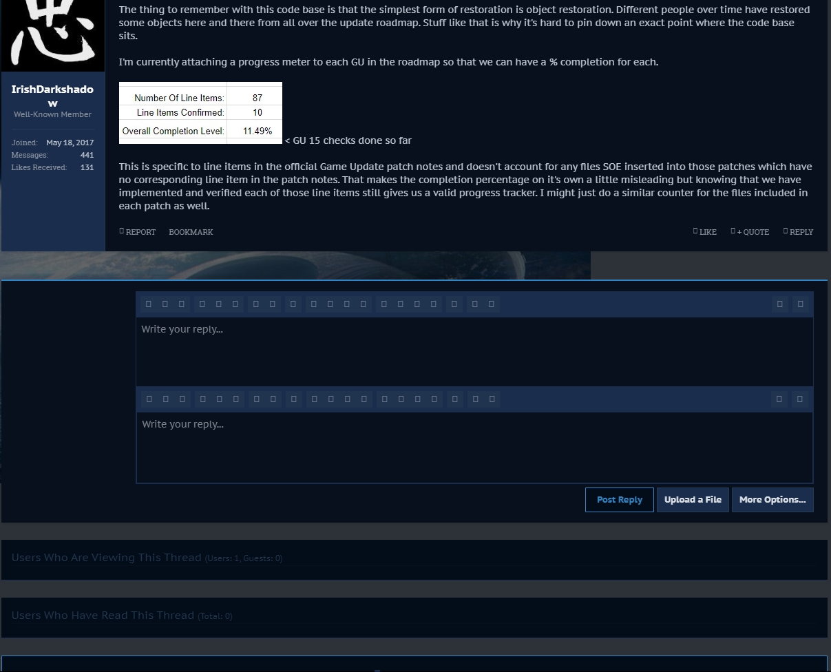 This is specific to line items in the official Game Update patch notes and doesn't account for any files SOE inserted into those patches which have no corresponding line item in the patch notes. That makes the completion percentage on it's own a little misleading but knowing that we have implemented and verified each of those line items still gives us a valid progress tracker. I might just do a similar counter for the files included in each patch as well. REPORT BOOKMARKLIKE + QUOTE REPLY Write your reply...