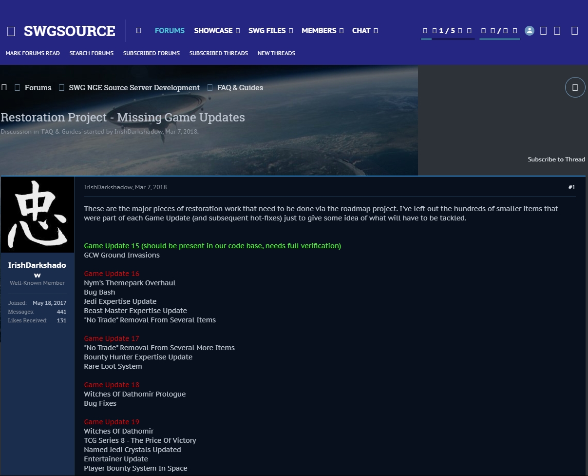 Forums SWG NGE Source Server Development FAQ & Guides Restoration Project - Missing Game Updates Discussion in 'FAQ & Guides' started by IrishDarkshadow, Mar 7, 2018.