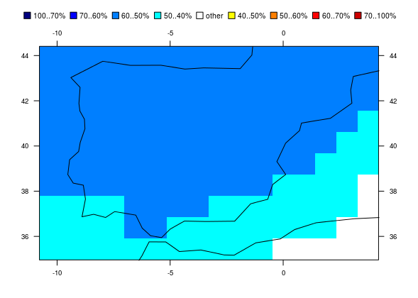 Function tercileMap stratifies probabilities according to terciles, to return a map showing the areas which have an increased probability (exceeding 40%) of being either below the lower tercile or above the upper tercile.