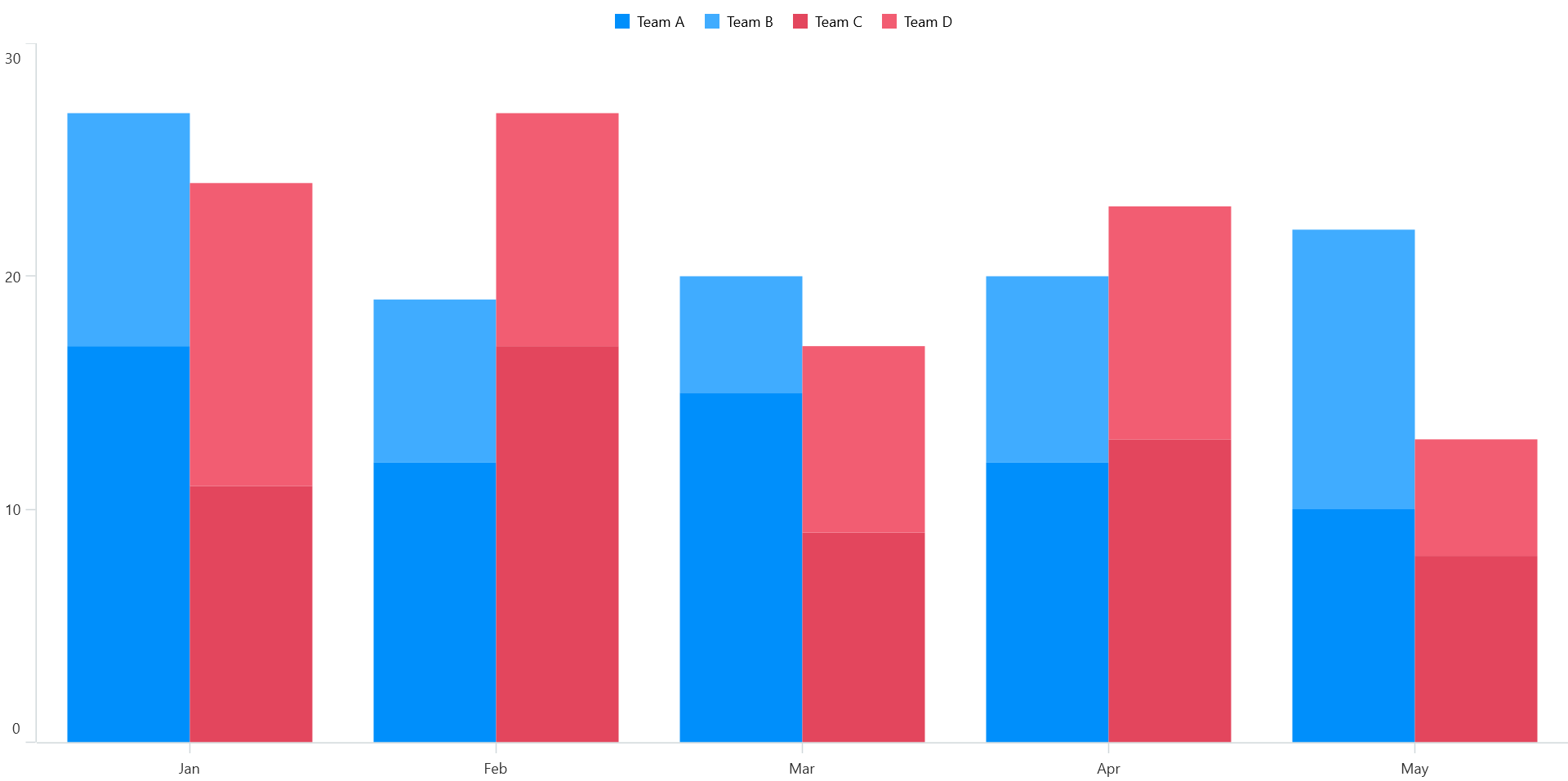 Consider a scenario with four stacking column series grouped into two entities, namely GroupOne and GroupTwo, distinguished by the GroupingLabel property. In the resulting chart, two stacking columns are rendered at a specific point— one representing GroupOne and the other representing GroupTwo. Specifically, TeamA and TeamB are associated with GroupOne, while TeamC and TeamD are affiliated with GroupTwo.