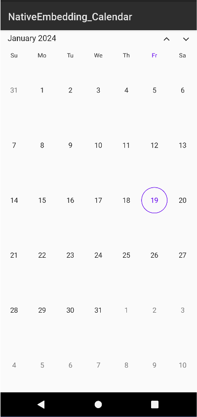 }Step 5: Convert the calendar control to a platform-specific view for the .NET MAUI framework and set this view as the content view for the current Android activity.