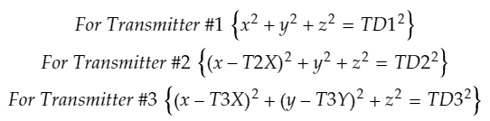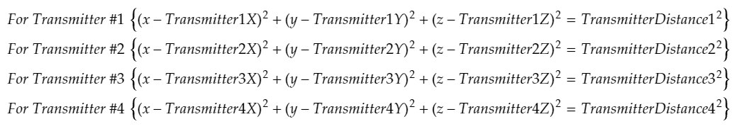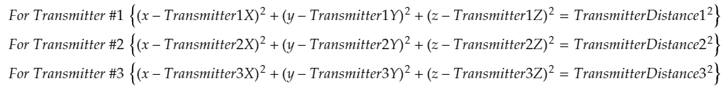Note how the equation for y actually uses x, and the equation for z uses y and x. While the instinct may be to substitute x and y out for their equations so you end up with a system of equations that only relies on the transmitter distances, we can actually leave those in there and just calculate the coordinates in order to save sanity.