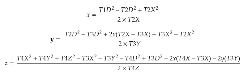 Thus, we can get one distance for each of the 4 transmitter stations. Using those 4 distances, we are able to mathematically deduce our coordinates.