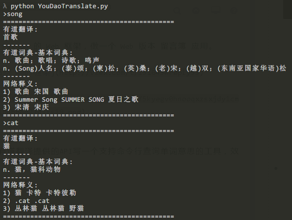 第 0023 题: 通过有道翻译提供的API写一个支持命令行翻译单词的工具,效果如下图: