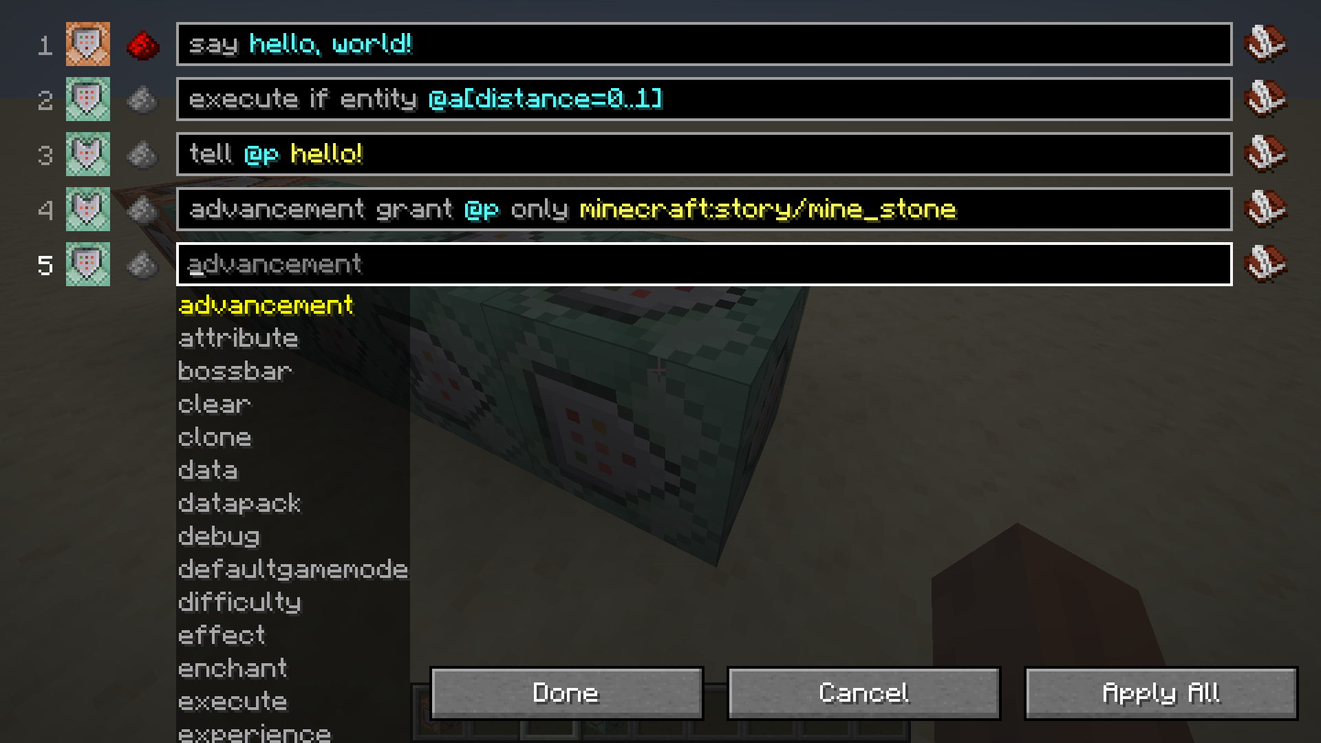 Replaces the command block GUI to allow editing multiple command blocks at once.