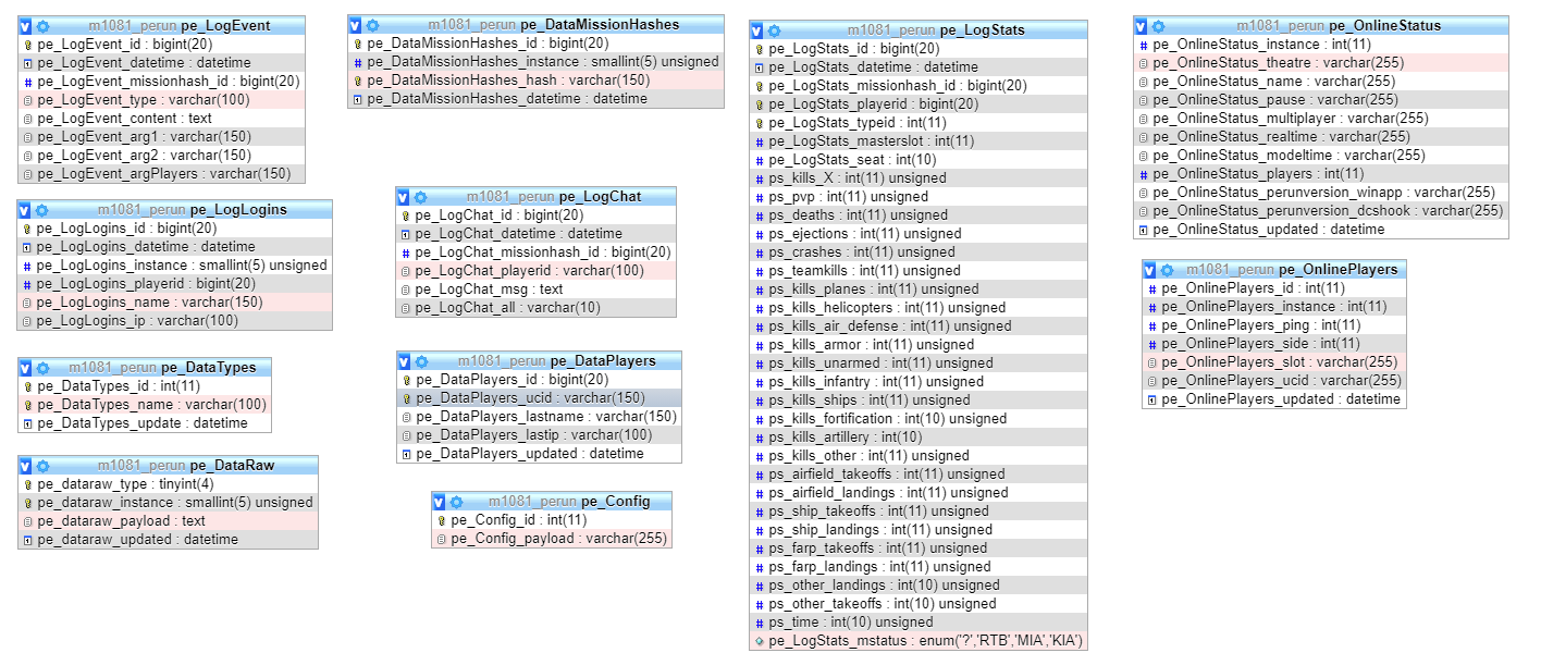 - table: pe_DataRaw - holds raw data received from perun windows app, containing debug/version information together with DCS SRS and LotATC data