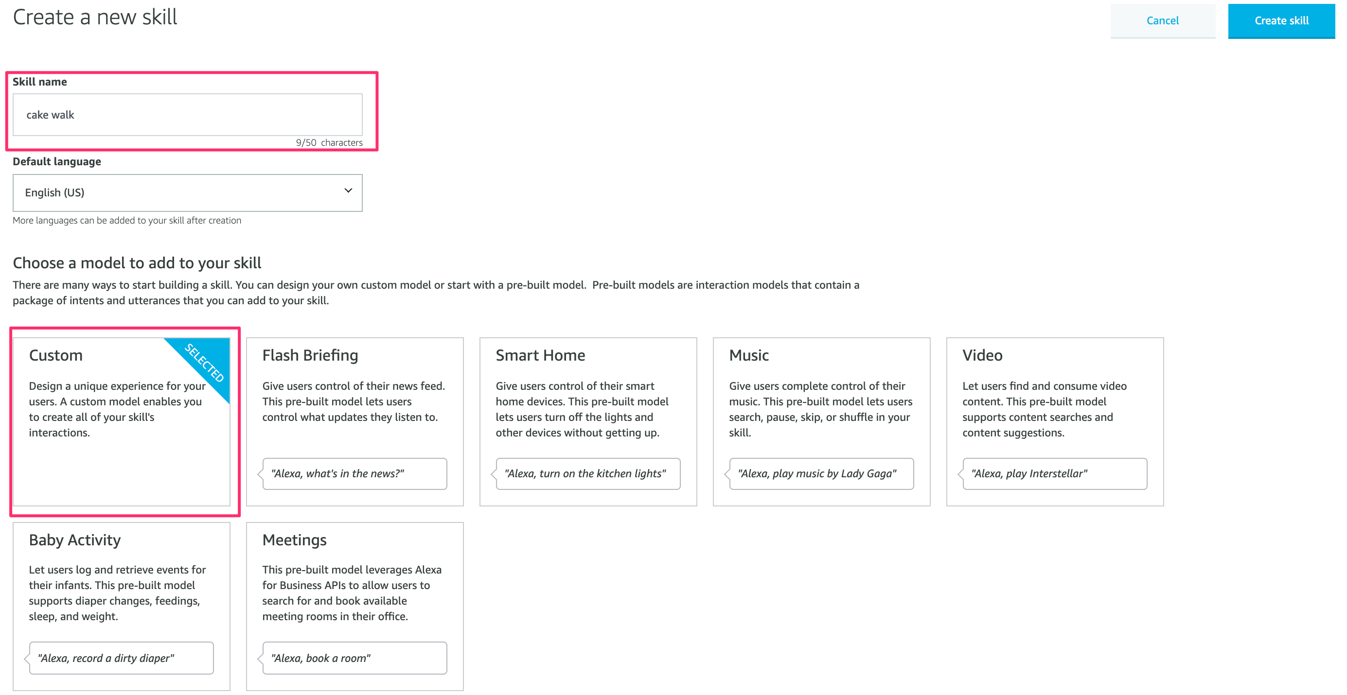 d. You are building a custom skill. Under Choose a model to add to your skill, select Custom.