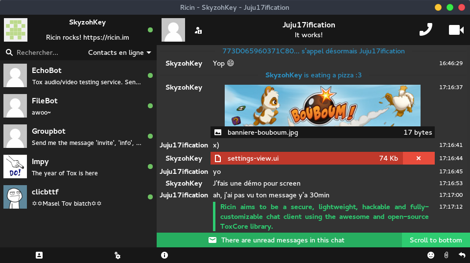 Ricin aims to be a secure, lightweight, hackable and fully-customizable chat client using the awesome and open-source ToxCore library. We know that there are several Tox clients but this project was initially made because the other clients are still missing many features that users have been waiting for over many months. Ricin is a simple but powerful cross-platform client written in Vala and using Gtk+ 3.0.