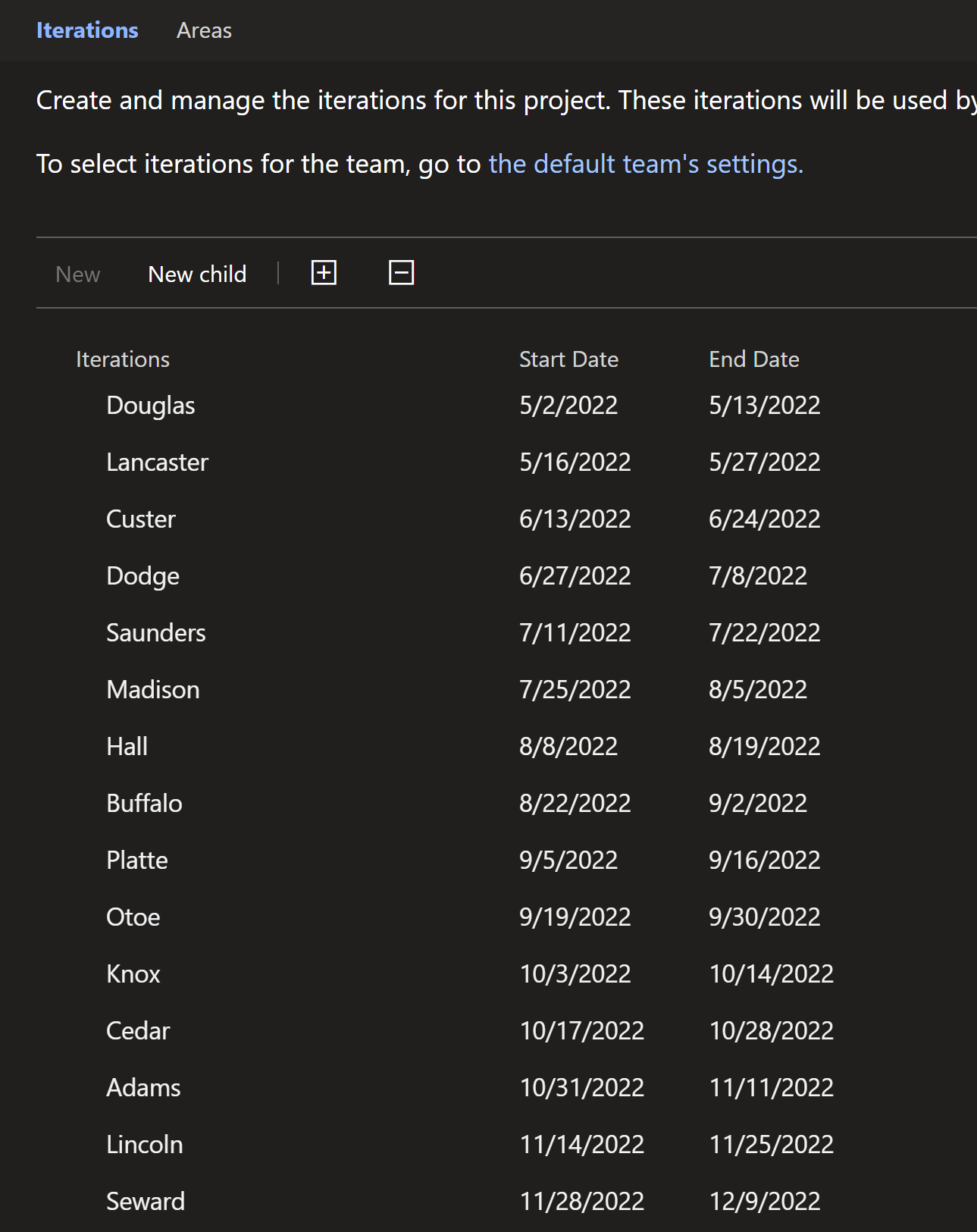 Create 93 Sprint iterations in Azure DevOps based on Nebraska counties ordered by license plate number.