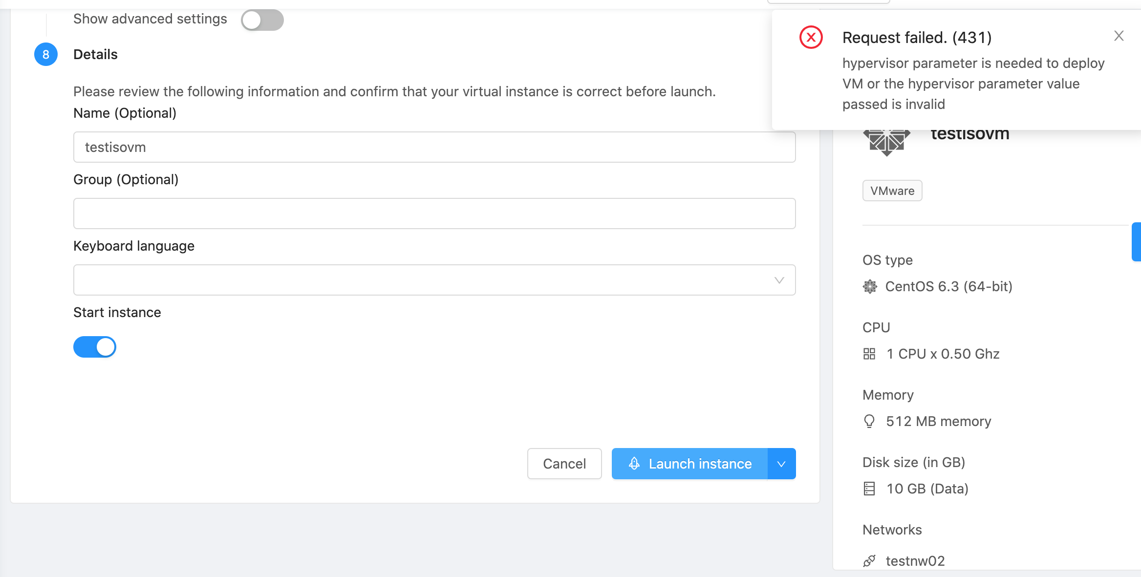 - Deploy VM using ISO and custom disk offering (specify any size, eg. 10 GB)