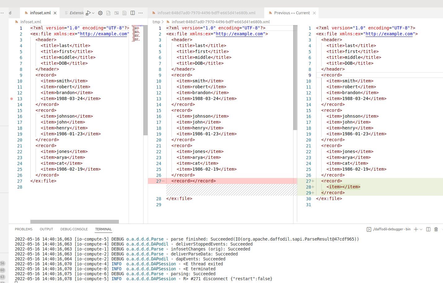 You can see that the final infoset is correct. The new-diff window does not reflect that the final element being added was retracted by backtracking to get the final infoset.