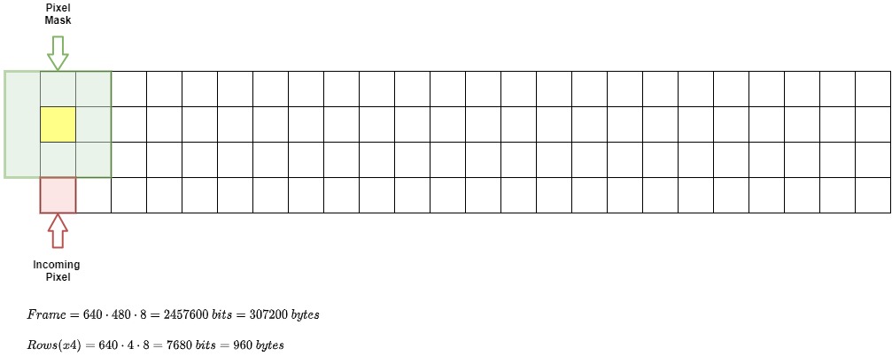Since we are using the limited M9K blocks available in the FPGA, we can't buffer a whole frame from the camera data. The following scheme is implemented, where we store 4 rows of data, use the oldest 3 to apply the kernel (green) and write in the last one (red):