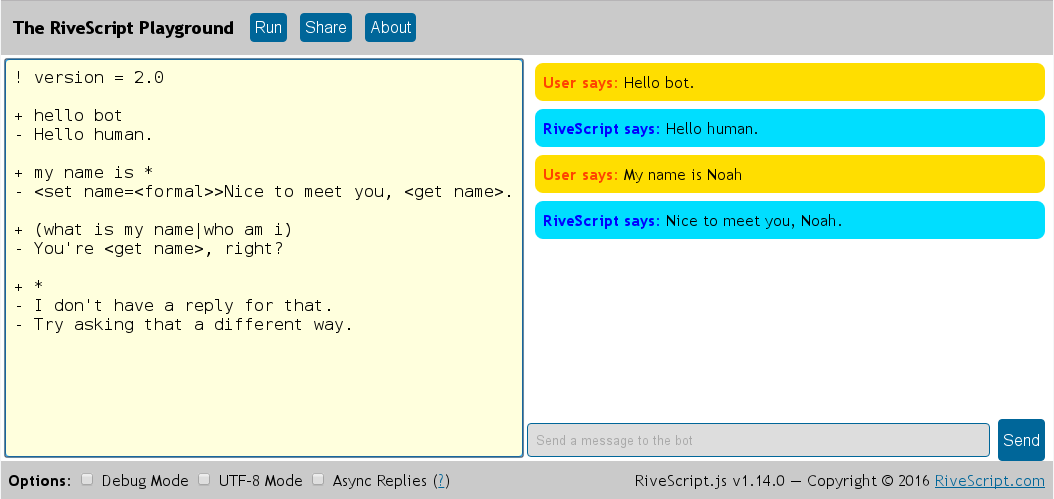 The RiveScript Playground is a web app where bot makers can develop, test, and share code snippets for RiveScript bots. It uses the JavaScript edition of RiveScript, so the bot runs on the user's own web browser, and provides a way to share code snippets with others (for example, to demonstrate how to do something or reproduce a bug).
