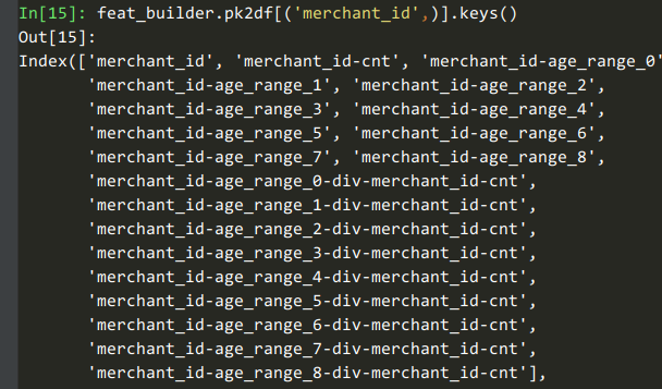该构造器的设计哲学是以主键为核心构建与主键相关的特征列。如本赛题中,训练数据的主键为user_id, merchant_id,那么我们就可以构造出user_id, merchant_id, user_id, merchant_id 这三个特征表。