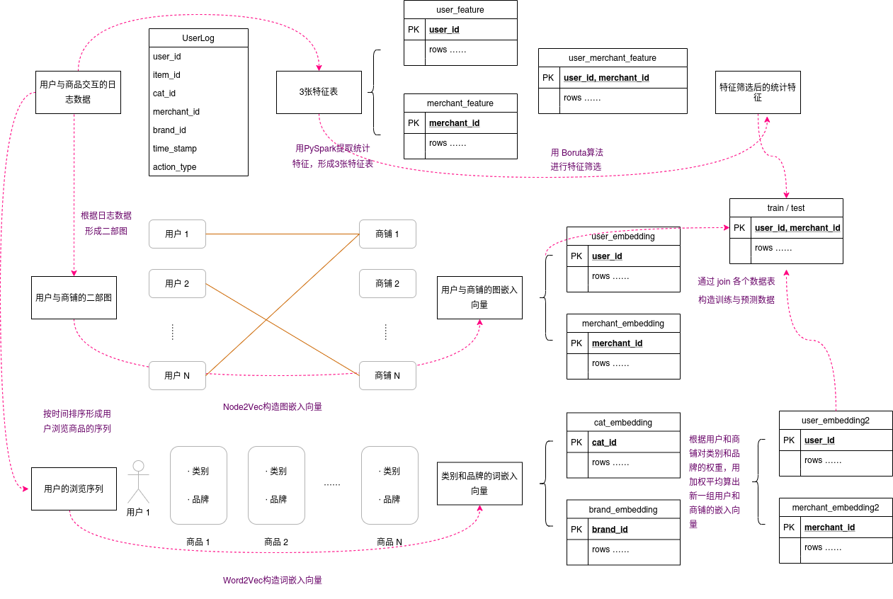 上图为本项目用到的特征工程,主要分为统计特征,图嵌入特征,词嵌入特征,最后通过join操作将各个特征join到主键为user_id, merchant_id的训练数据上。