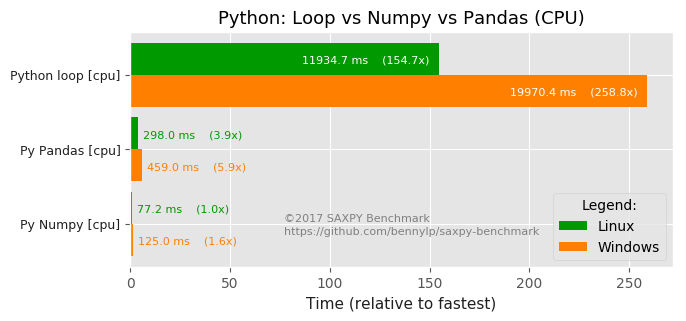 Benchmarking the performance of Numpy vs Panda (vs plain Python loop)