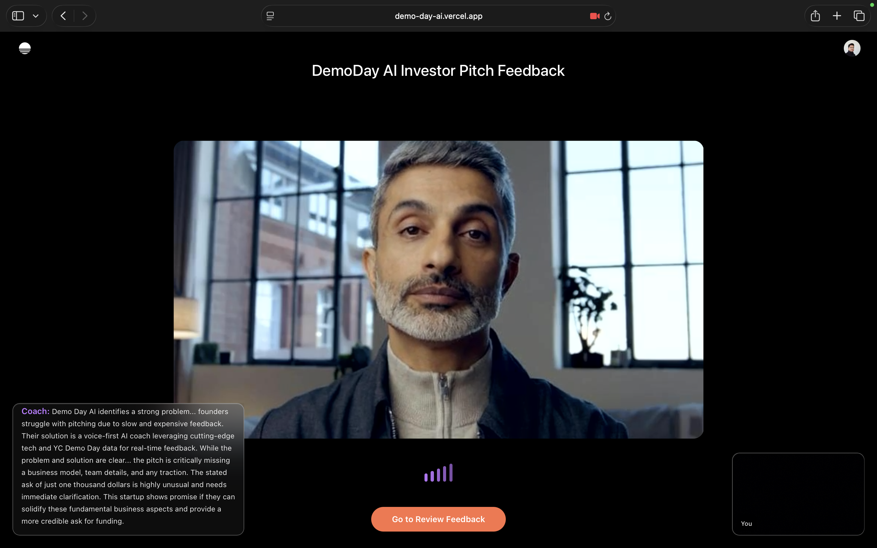 The experience is fully voice-driven, using natural spoken feedback (ElevenLabs + Anam) with realistic tone, pacing and emphasis. Under the hood, feedback is grounded via RAG over Y Combinator talks and Demo Day guidance, combined with your own materials (pitch deck, docs) to ensure advice reflects real investor expectations—not generic tips.