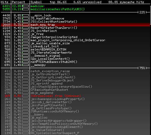 The outgoing tree in the picture above shows a function where 97.4% of the total time is spend in the descendant functions, and 95.5% of that time goes through a function called mach_vm_read_overwrite. The selected function itself only contributes 2.6%. The total contribution to the function profile of the selected function and all its descendants is 27.3%.