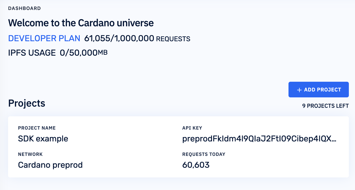 projectId: 'YOUR API KEY HERE', // see: https://blockfrost.io