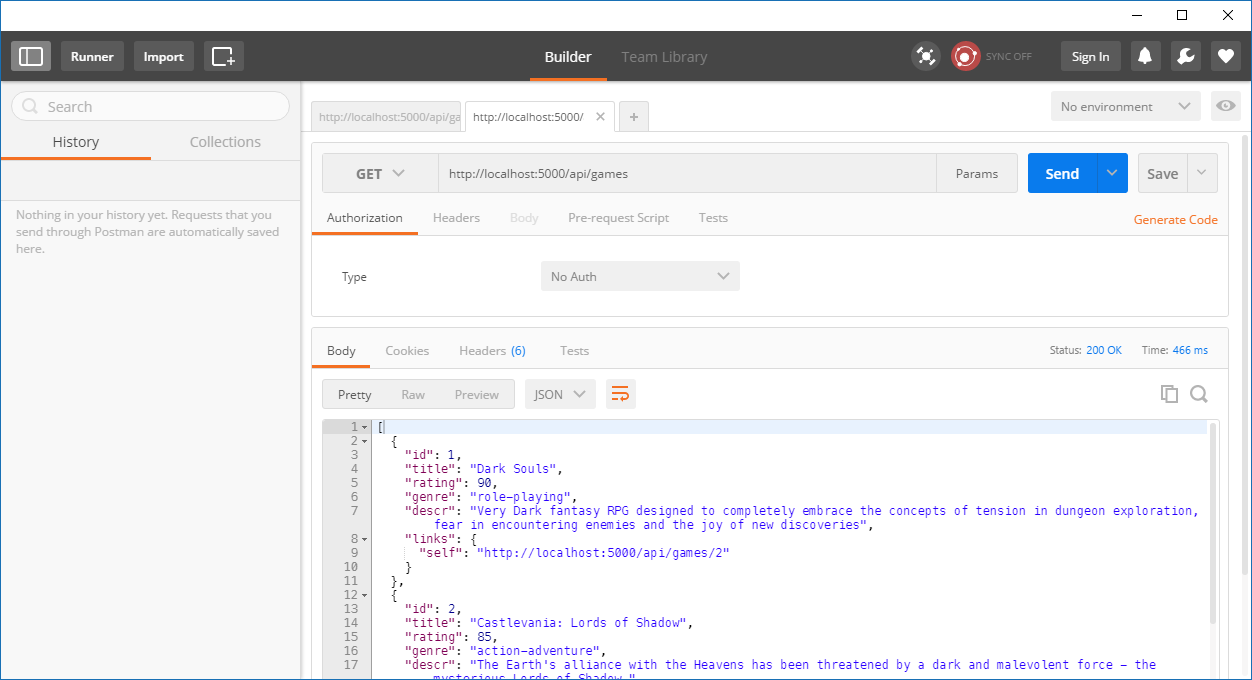 - Select GET from drop-down and type required url into input box, in this case http://localhost:5000/api/games/