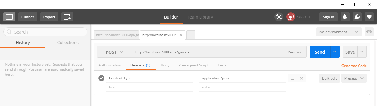 - Select POST and type http://localhost:5000/api/games/