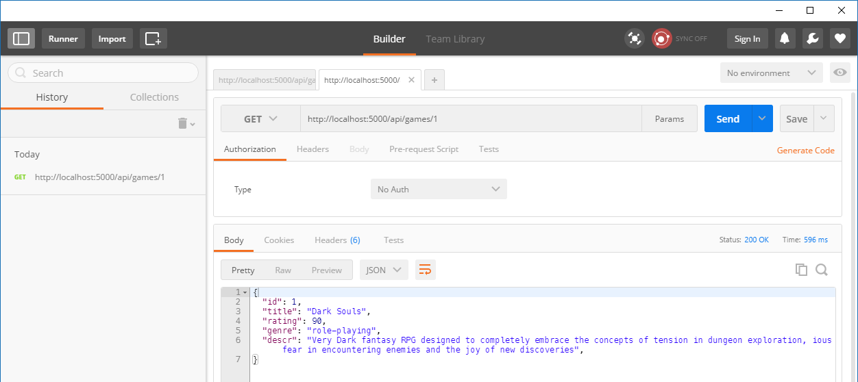 - Type http://localhost:5000/api/games/1 and check response for single item (response body and status code)
