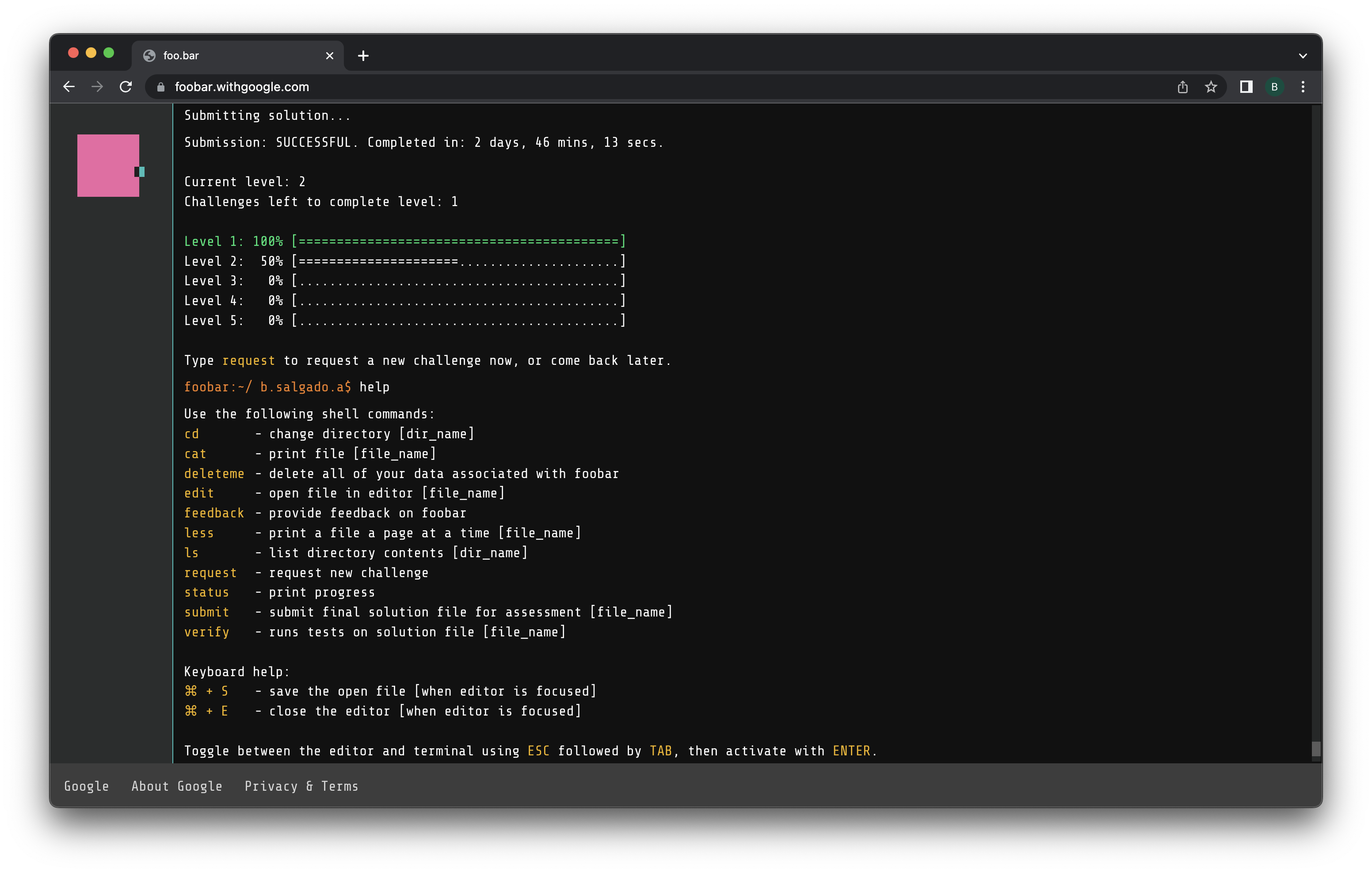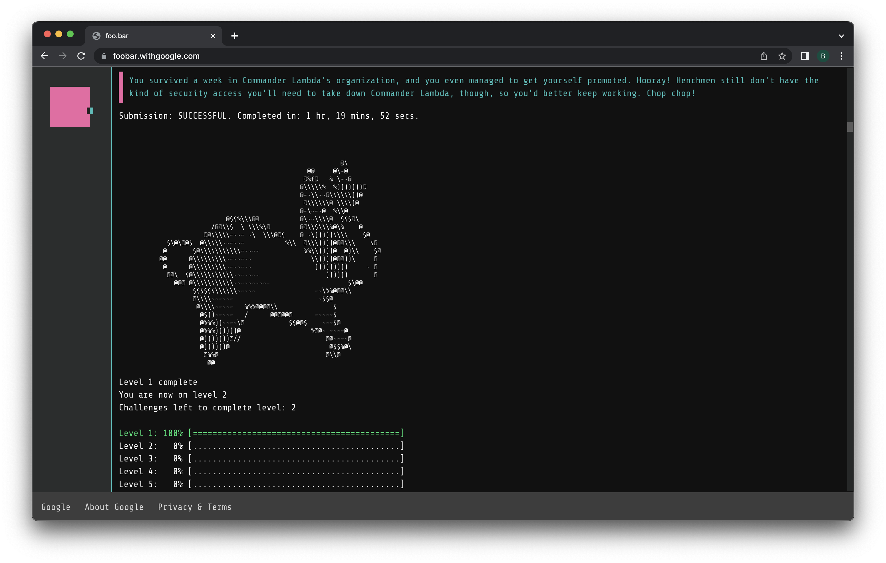 I honestly thought it was some kind of Google's homepage commemorative day and moved on with what I was doing but, fortunately (!), something caught my attention and I decided to left that tab open to come back later, only to realize that it was a Google Foobar Challenge!