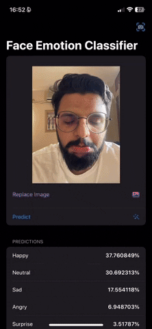 Face Emotion Classifier Swift A SwiftUI App to Classify Human Emotions Dataset: Kaggle Model: Uploaded to HuggingFace 🤗 Preview: Image Conversion Method's Credits: UIImage -> CVPixelBuffer francoismarceau29
