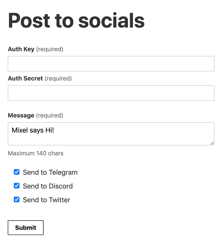 A simple REST based API service written in Go which relays a message via the API to social messaging networks. The service currently supports posting 140 char messages to Twitter, Telegram (chat) and Discord (channel).