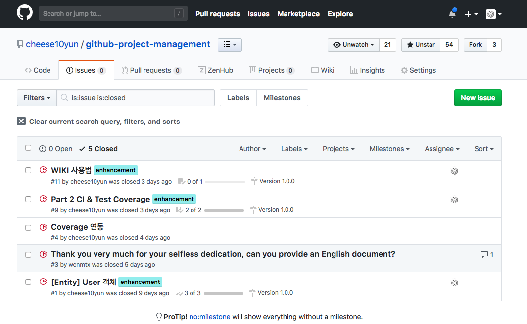 ZenHub 사용과 직접적인 기능은 아니지만, Milestone 여러 항목을 만들고 대부분 Icebox에 있는 issue가 아니라면 적절한 Milestone에 위치시키는 것을 권장합니다. 전체적인 작업에 진행 척도를 가시적으로 확인하기 좋은 점, 해당 Milestone(버전)에 추가되는 기능, 강화되는 기능, 수정된 버그 등을 직관적이로 표시 할 수 있습니다. 또 전체 Milestone 진척도를 알 수 있어 남은 시간도 산출하기 좋은 장점이 있습니다.