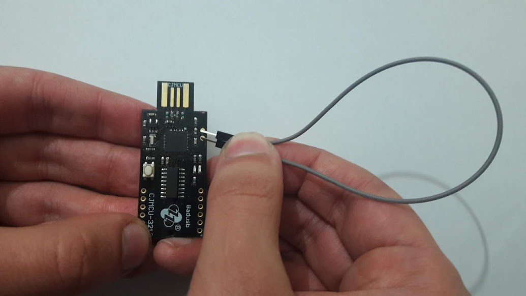 We need to put the ESP8266 in flash mode (set GPIO0 LOW during boot of the board), to do so bridge the two metal circles on the top right before connect the CJMCU to the USB, you can use a jumper wire for example. Once connected to USB you can remove the bridge as the ESP8266 will stay in flash mode (image)