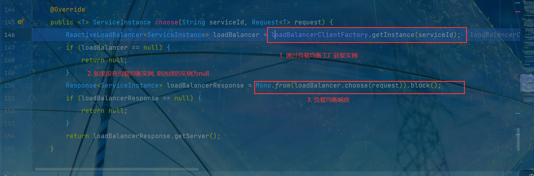 /** * The default {@link LoadBalancerClient} implementation. * * @author Olga Maciaszek-Sharma * @since 2.2.0 */ @SuppressWarnings({ "unchecked", "rawtypes" }) public class BlockingLoadBalancerClient implements LoadBalancerClient { ... ... ... }了解了 loadBalancer 是什么, 继续往方法下面走