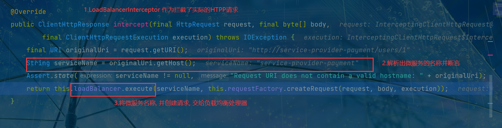 - 通过 debug 模式, 进入到 LoadBalancerInterceptor.intercept(...)