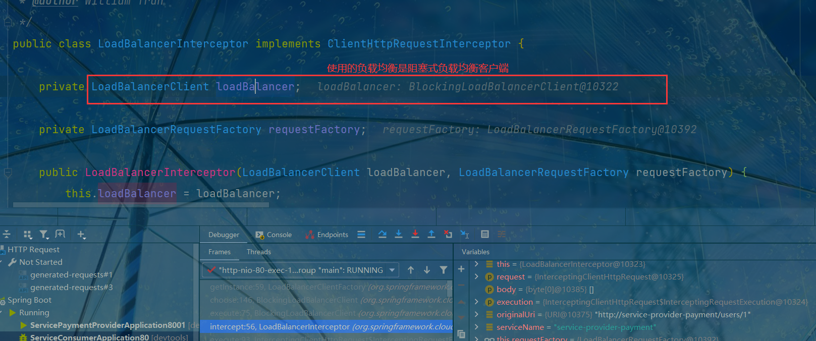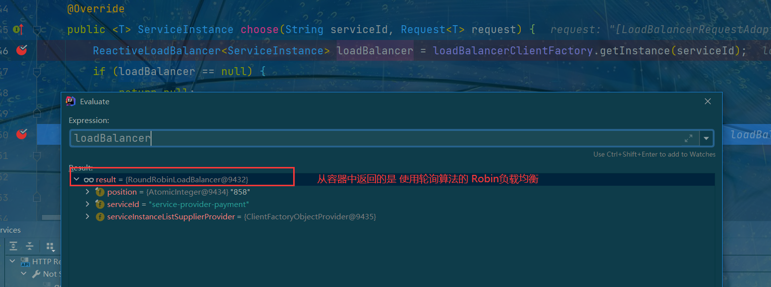 本地负载均衡肯定是在执行 HTTP 请求时进行的; 所以, 我们给下面这行语句打上断点并进入到debug模式