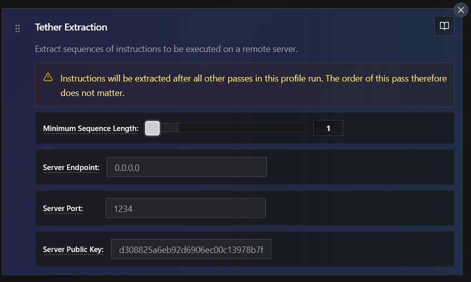 The instruction extraction process and embedded Tether client is processed by CodeDefender. Once you have established an account with the proper subscription you can add the following obfuscation pass: