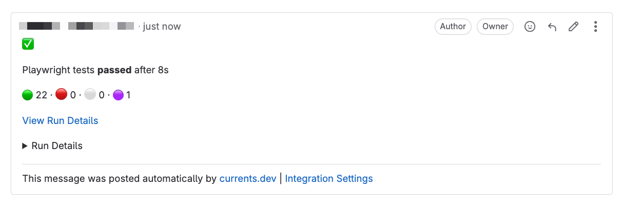 +When [GitLab integration](https://currents.dev/readme/integrations/gitlab) is enabled, Currents will post a Merge Commit note with run results: