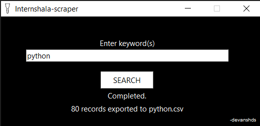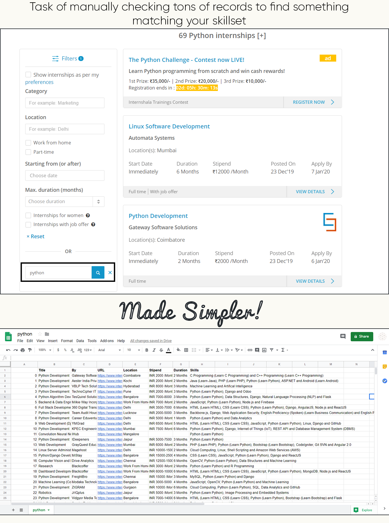 Simplifies the task of finding and applying to relevant internships on internshala.com by fetching all the records that match a certain keyword and exporting them to a more manageable .csv format.