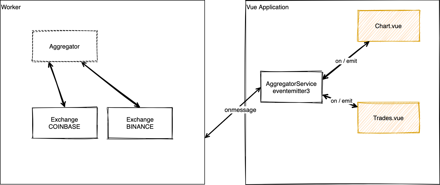 The core functionality involves an aggregator that processes raw trades within a dedicated Worker for each Exchange. The aggregator's main objective is to group trades based on time, market, and trade side. Periodically, the worker sends the aggregated trades to the user interface (UI), accompanied by relevant statistics regarding market activity. These statistics include volume sums, trade counts categorized by sides, and information about liquidations.