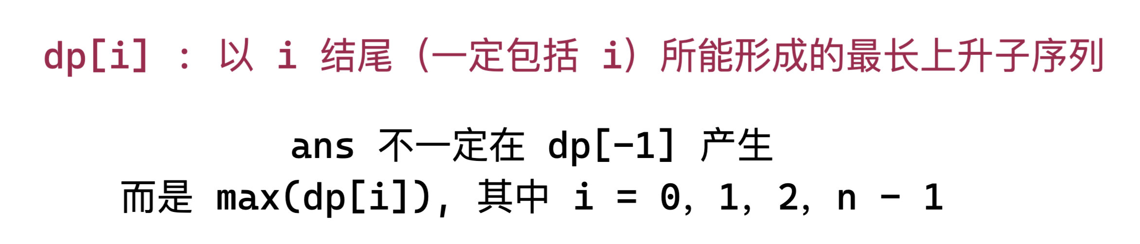 第一种定义方式虽然需要比较不同的 dp[i] 从而获得结果,但是我们可以在循环的时候顺便得出,对复杂度不会有影响,只是代码多了一点而已。因此我们选择第一种建模方式。