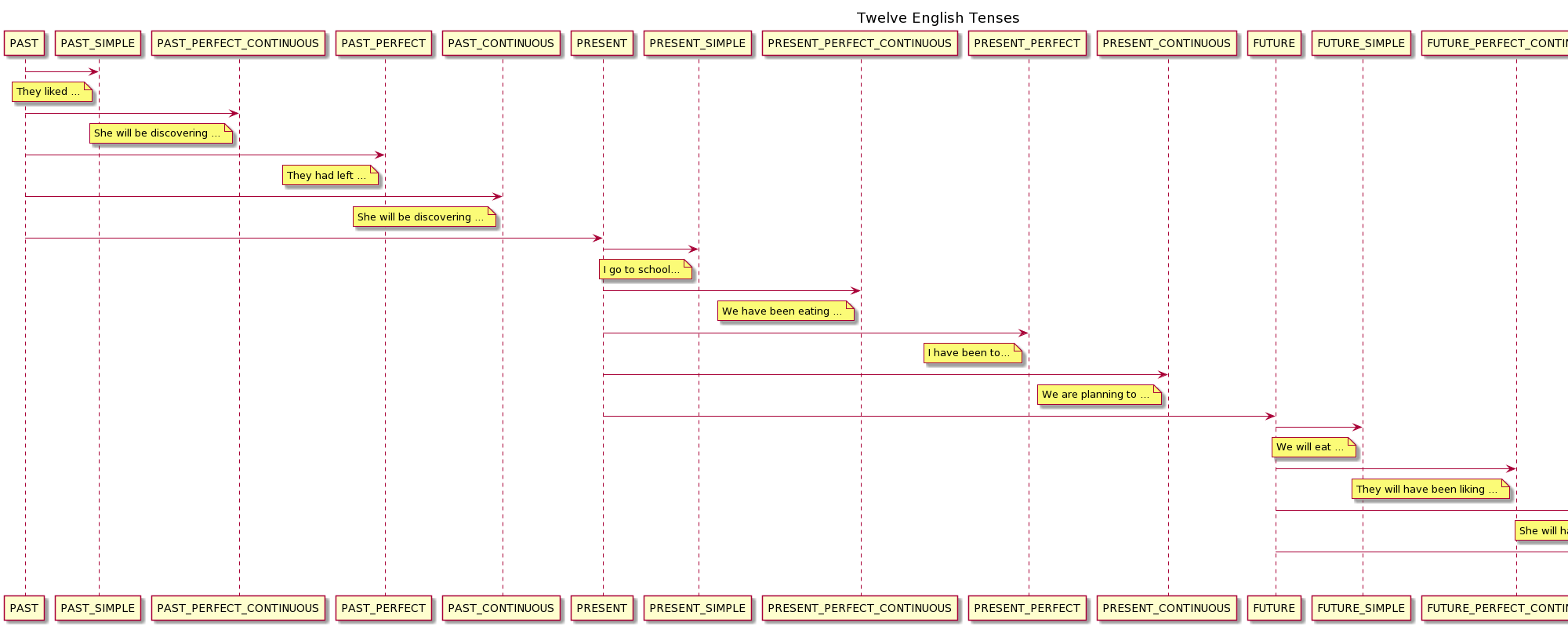note left of PAST_PERFECT_CONTINUOUS: She will be discovering ...