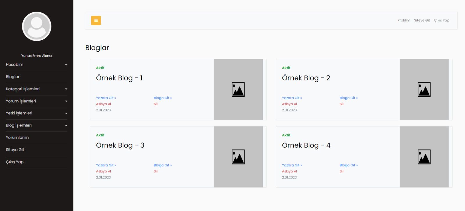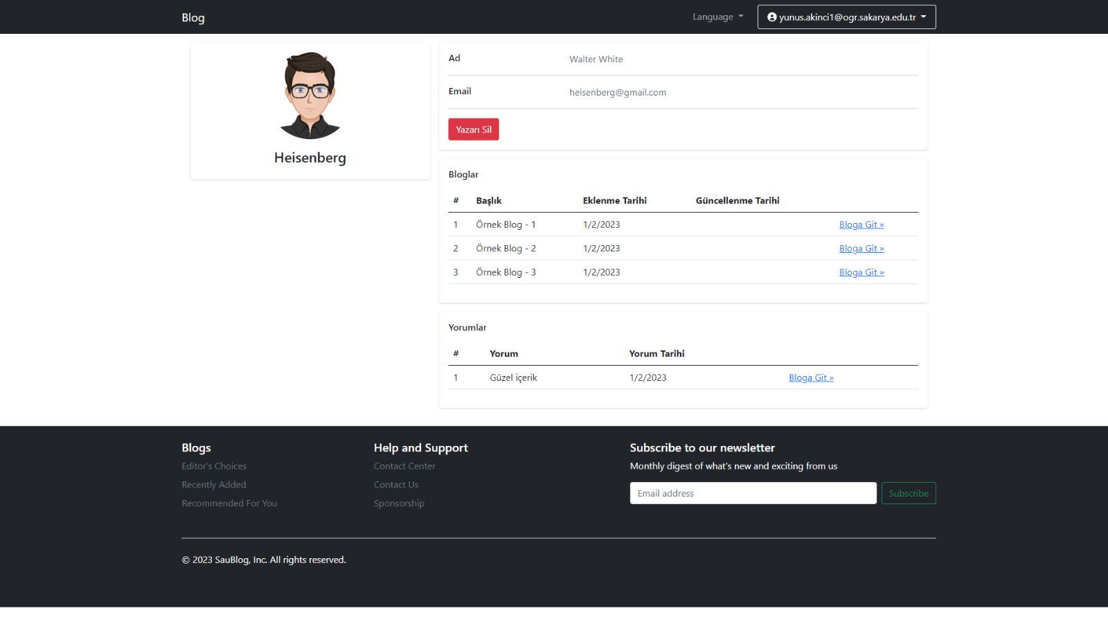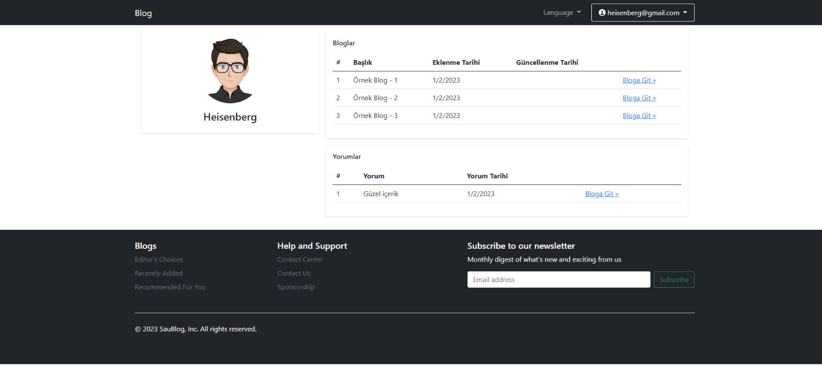 SauBlog SauBlog, kullanıcıların kayıt olup blog yazabildiği, bloglara yorum yapabildiği bir blog sitesidir. Kullanılan Teknolojiler Backend: Asp.Net Core 6 MVC, Entity Framework Core ORM Frontend: HTML5, CSS3, Javascript, Bootstrap Database: PostgreSQL Ekran Görüntüleri