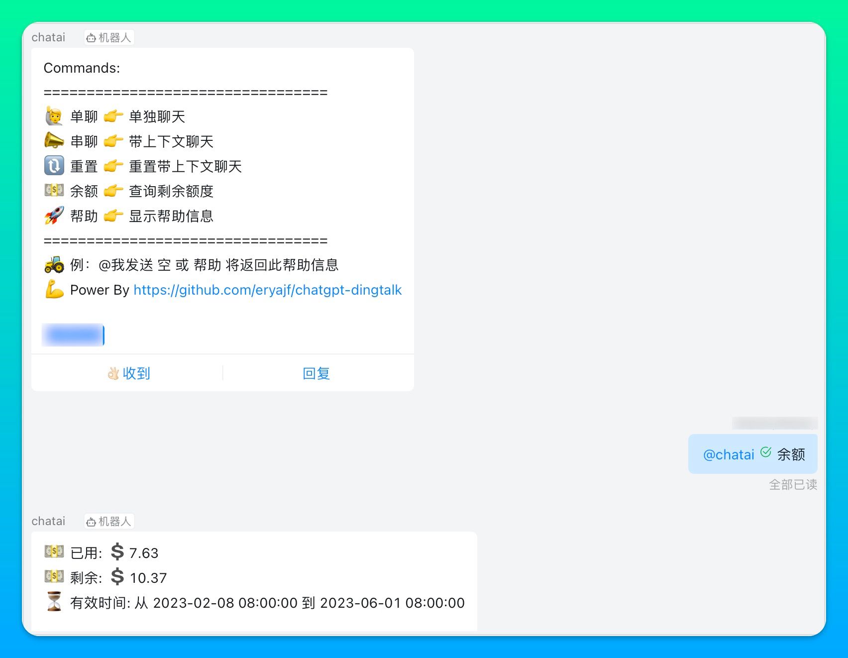 help: "### 发送信息\n\n若您想给机器人发送信息,有如下两种方式:\n\n1. **群聊:** 在机器人所在群里 **@机器人** 后边跟着要提问的内容。\n\n2. **私聊:** 点击机器人的 **头像** 后,再点击 **发消息。** \n\n### 系统指令\n\n系统指令是一些特殊的词语,当您向机器人发送这些词语时,会触发对应的功能。\n\n**📢 注意:系统指令,即只发指令,没有特殊标识,也没有内容。**\n\n以下是系统指令详情:\n\n| 指令 | 描述 | 示例 |\n| :--------: | :------------------------------------------: | :----------------------------------------------------------: |\n| **单聊** | 每次对话都是一次新的对话,没有聊天上下文联系 | <details><br /><summary>预览</summary><br /><img src='https://cdn.jsdelivr.net/gh/eryajf/tu/img/image_20230404_193608.jpg'><br /></details> |\n| **串聊** | 带上下文联系的对话模式 | <details><br /><summary>预览</summary><br /><img src='https://cdn.jsdelivr.net/gh/eryajf/tu/img/image_20230404_193608.jpg'><br /></details> |\n| **重置** | 重置上下文模式,回归到默认模式 | <details><br /><summary>预览</summary><br /><img src='https://cdn.jsdelivr.net/gh/eryajf/tu/img/image_20230404_193608.jpg'><br /></details> |\n| **余额** | 查询机器人所用OpenAI账号的余额 | <details><br /><summary>预览</summary><br /><img src='https://cdn.jsdelivr.net/gh/eryajf/tu/img/image_20230304_222522.jpg'><br /></details> |\n| **模板** | 查看应用内置的prompt模板 | <details><br /><summary>预览</summary><br /><img src='https://cdn.jsdelivr.net/gh/eryajf/tu/img/image_20230404_193827.jpg'><br /></details> |\n| **图片** | 查看如何根据提示生成图片 | <details><br /><summary>预览</summary><br /><img src='https://cdn.jsdelivr.net/gh/eryajf/tu/img/image_20230404_194125.jpg'><br /></details> |\n| **查对话** | 获取指定人员的对话历史 | <details><br /><summary>预览</summary><br /><img src='https://cdn.jsdelivr.net/gh/eryajf/tu/img/image_20230404_193938.jpg'><br /></details> |\n| **帮助** | 获取帮助信息 | <details><br /><summary>预览</summary><br /><img src='https://cdn.jsdelivr.net/gh/eryajf/tu/img/image_20230404_202336.jpg'><br /></details> |\n\n\n### 功能指令\n\n除去系统指令,还有一些功能指令,功能指令是直接与应用交互,达到交互目的的一种指令。\n\n**📢 注意:功能指令,一律以 #+关键字 为开头,通常需要在关键字后边加个空格,然后再写描述或参数。**\n\n以下是功能指令详情\n\n| 指令 | 说明 | 示例 |\n| :--: | :--: | :--: |\n| **#图片** | 根据提示咒语生成对应图片 | <details><br /><summary>预览</summary><br /><img src='https://cdn.jsdelivr.net/gh/eryajf/tu/img/image_20230323_150547.jpg'><br /></details> |\n| **#域名** | 查询域名相关信息 | <details><br /><summary>预览</summary><br /><img src='https://cdn.jsdelivr.net/gh/eryajf/tu/img/image_20230404_202620.jpg'><br /></details> |\n| **#证书** | 查询域名证书相关信息 | <details><br /><summary>预览</summary><br /><img src='https://cdn.jsdelivr.net/gh/eryajf/tu/img/image_20230404_202706.jpg'><br /></details> |\n| **#Linux命令** | 根据自然语言描述生成对应命令 | <details><br /><summary>预览</summary><br /><img src='https://cdn.jsdelivr.net/gh/eryajf/tu/img/image_20230404_214947.jpg'><br /></details> |\n| **#解释代码** | 分析一段代码的功能或含义 | <details><br /><summary>预览</summary><br /><img src='https://cdn.jsdelivr.net/gh/eryajf/tu/img/image_20230404_215242.jpg'><br /></details> |\n| **#正则** | 根据自然语言描述生成正则 | <details><br /><summary>预览</summary><br /><img src='https://cdn.jsdelivr.net/gh/eryajf/tu/img/image_20230404_220222.jpg'><br /></details> |\n| **#周报** | 应用周报的prompt | <details><br /><summary>预览</summary><br /><img src='https://cdn.jsdelivr.net/gh/eryajf/tu/img/image_20230404_214335.jpg'><br /></details> |\n| **#生成sql** | 根据自然语言描述生成sql语句 | <details><br /><summary>预览</summary><br /><img src='https://cdn.jsdelivr.net/gh/eryajf/tu/img/image_20230404_221325.jpg'><br /></details> |\n\n如上大多数能力,都是依赖prompt模板实现,如果你有更好的prompt,欢迎提交PR。\n\n### 友情提示\n\n使用 **串聊模式** 会显著加快机器人所用账号的余额消耗速度,因此,若无保留上下文的需求,建议使用 **单聊模式。** \n\n即使有保留上下文的需求,也应适时使用 **重置** 指令来重置上下文。\n\n### 项目地址\n\n本项目已在GitHub开源,[查看源代码](https://github.com/eryajf/chatgpt-dingtalk)。"