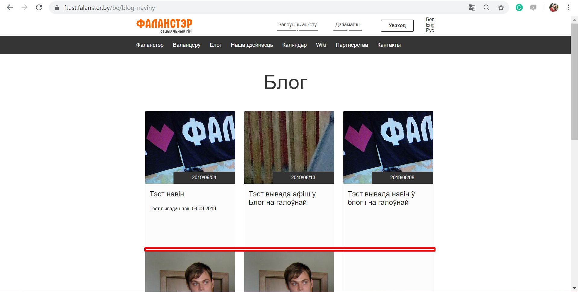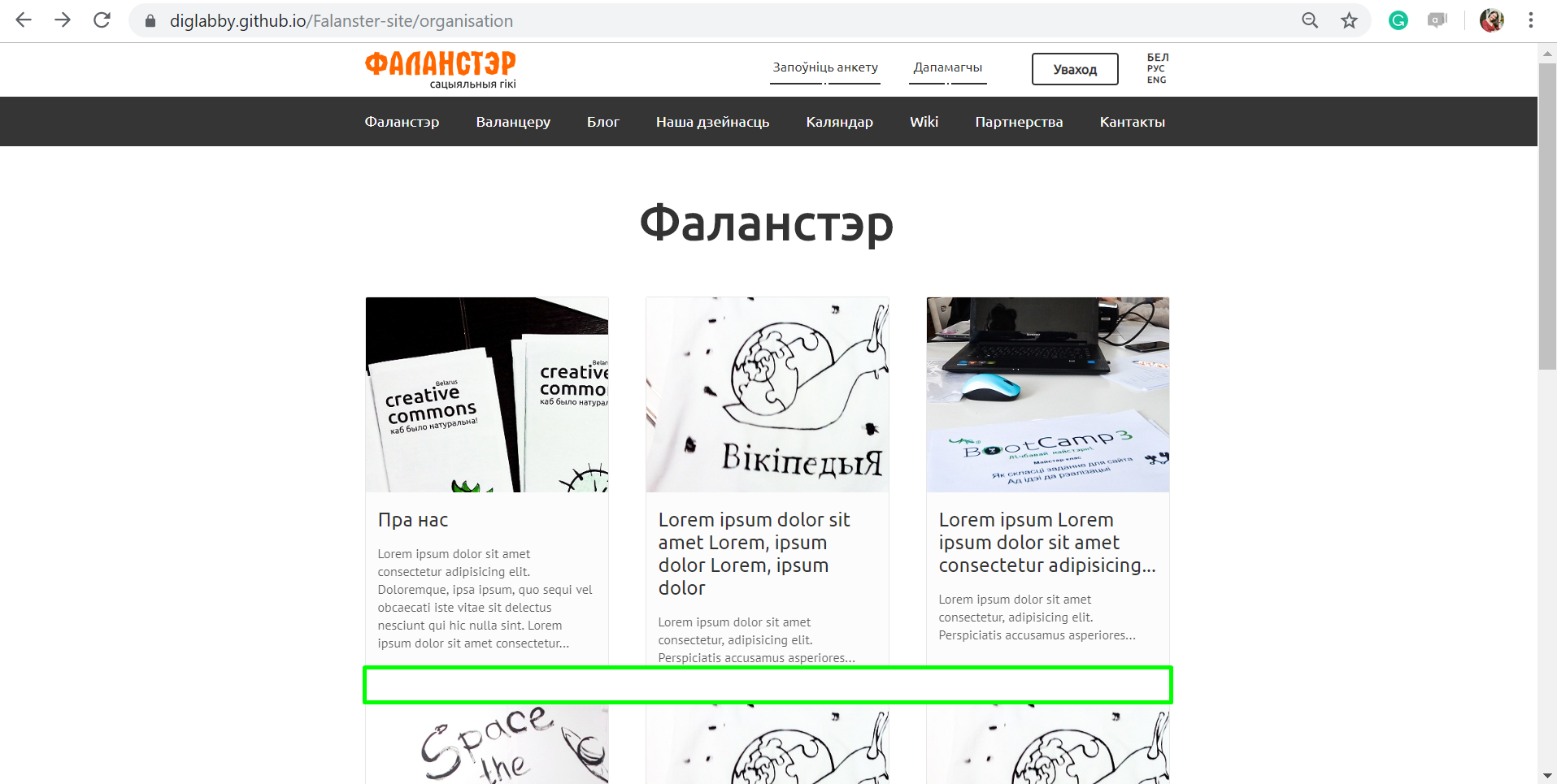 ## Як зараз - https://ftest.falanster.by/be/organization-inner - https://ftest.falanster.by/be/blog-naviny - https://ftest.falanster.by/be/projects-clubs  ## Як павінна быць - https://diglabby.github.io/Falanster-site/organisation