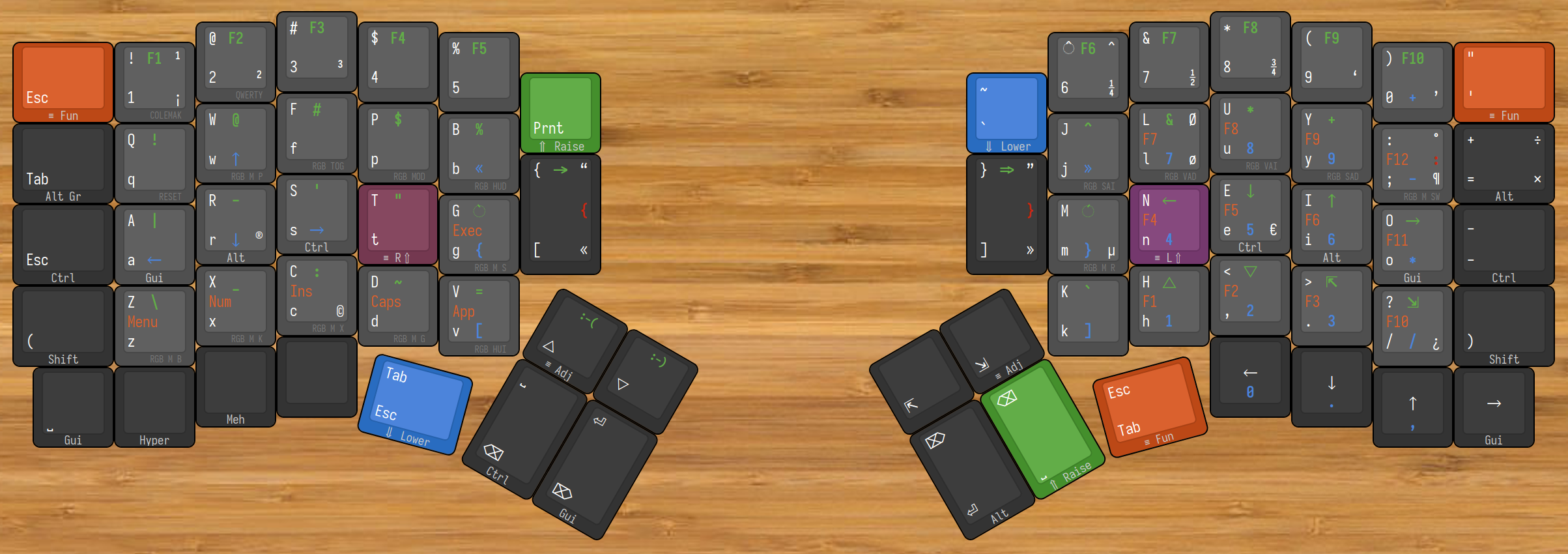 Space,Esc,CtrlandEnterkeys. I like to have this keys on both halves. - Added macro to print
