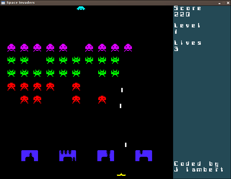 This is a recreation of the classic space invaders video game. Loosly based on the AtariST version by Robert HC Leong(1990)