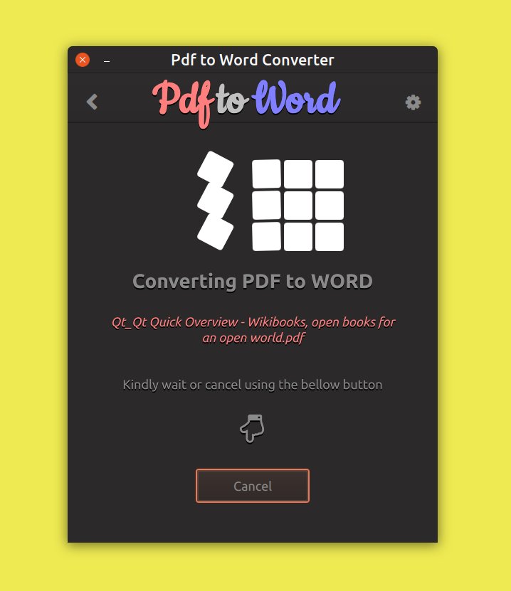 This is a free and open source pdf to word converter application written using Qt/Qml 5.11. It support converting any pdf file to an editable word file. It use the LibreOffice command line tool as it work as a GUI.