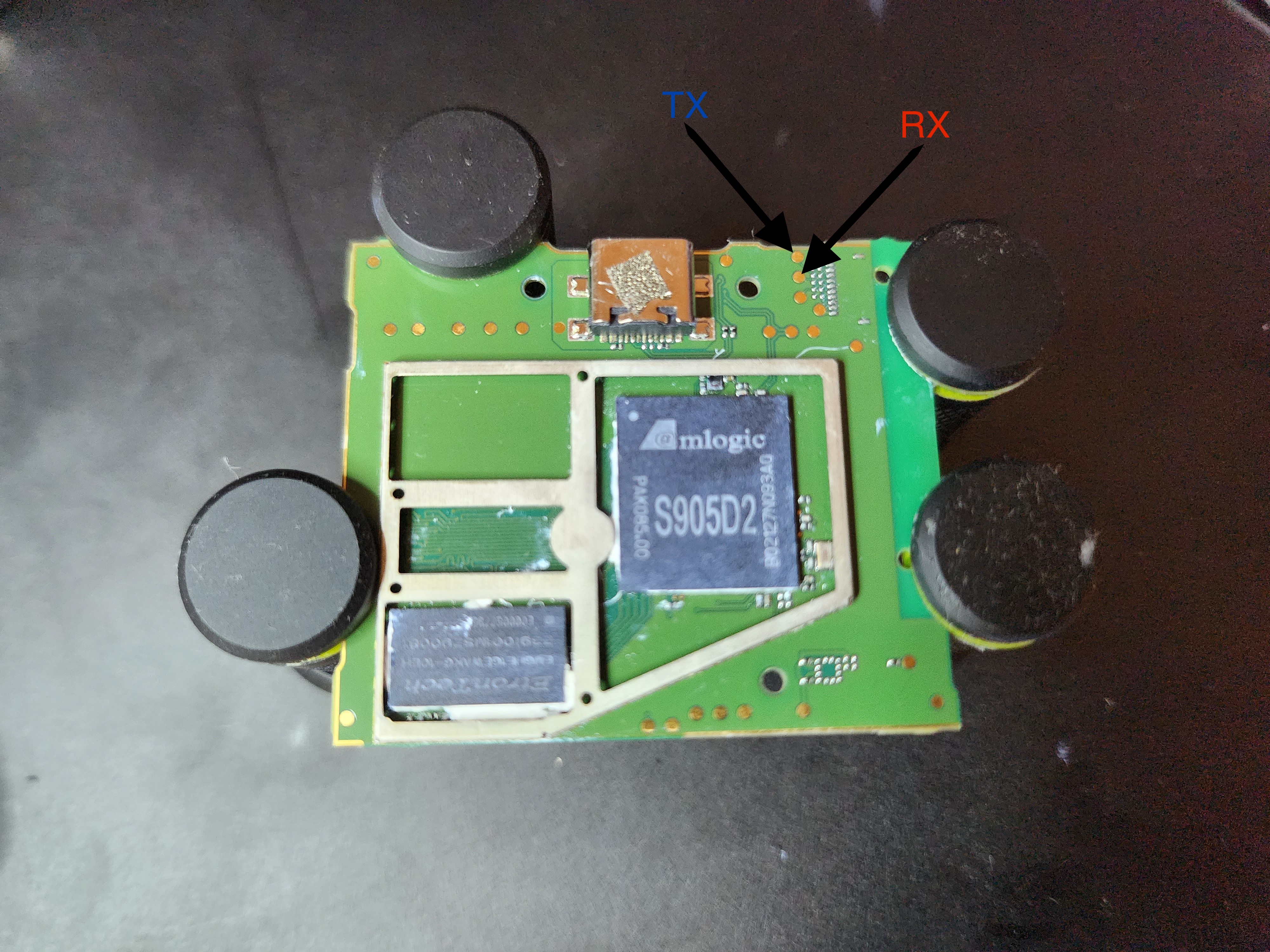 At this point, it became clear UART would aid our efforts, and with some simple voltage sniffing and an educated guess, we discerned the UART has the following pin-out: