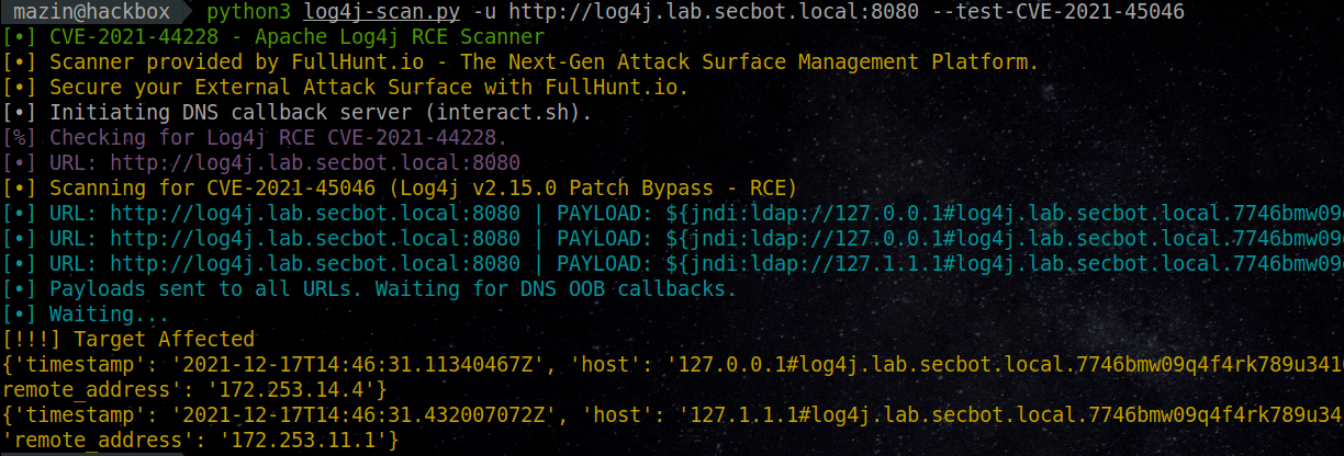 [--wait-time WAIT_TIME] [--waf-bypass] [--custom-waf-bypass-payload CUSTOM_WAF_BYPASS_PAYLOAD] [--test-CVE-2021-45046] [--test-CVE-2022-42889]